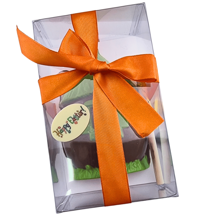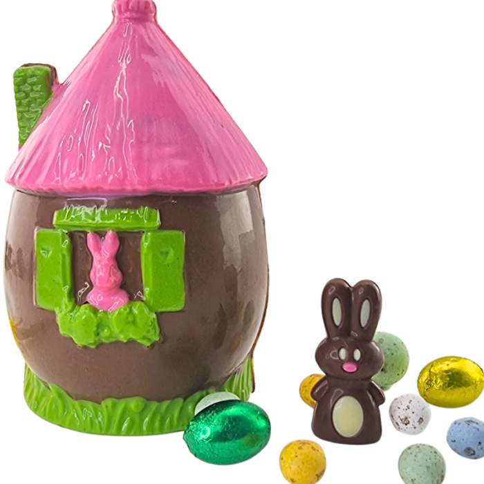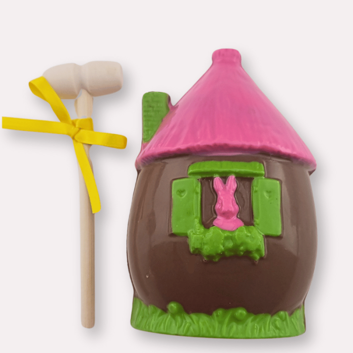 A milk chocolate hollow bunny hutch, smash to reveal hand-made bunnies and chocolate Easter eggs. Presented in a cellophane gift box with ribbon, ready to gift.