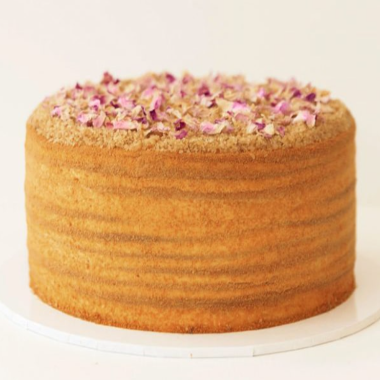 The Original Honey Cake - It is made of many thin caramelised honey layers held together with a cream of sweet and sour ingredients. It is dusted in honey crumbs, topped with crushed walnuts and Dried Rose petals.