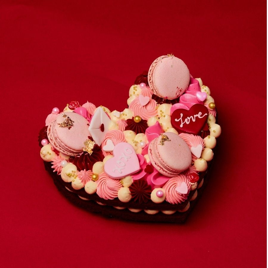 A heart-shaped Valentine’s special, delicately decorated with macarons and handcrafted details. Available in Red Velvet with cream cheese buttercream or Dark Chocolate with original vanilla buttercream — a sweet centrepiece made your day even more special.