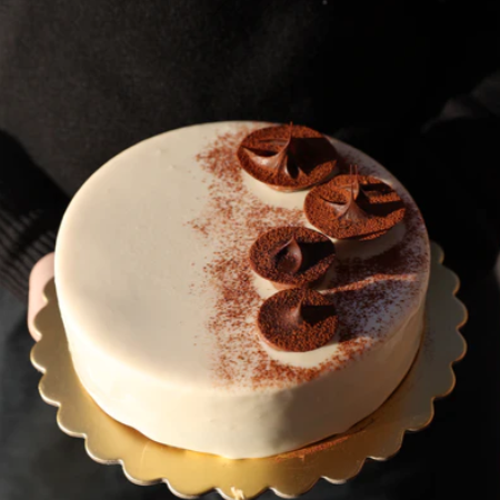Papa’s Vanilla & Chocolate Semifreddo is meant to be eaten semi-frozen, with the texture of a frozen mousse. Finished with white chocolate glaze and chocolate decoration.
