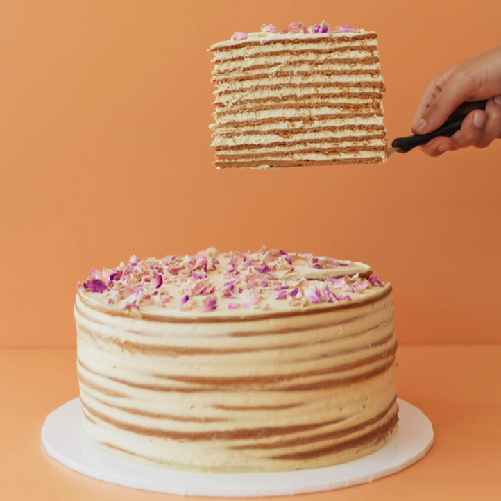The Original Honey Cake - It is made of many thin caramelised honey layers held together with a cream of sweet and sour ingredients. It is dusted in honey crumbs, topped with crushed walnuts and Dried Rose petals.