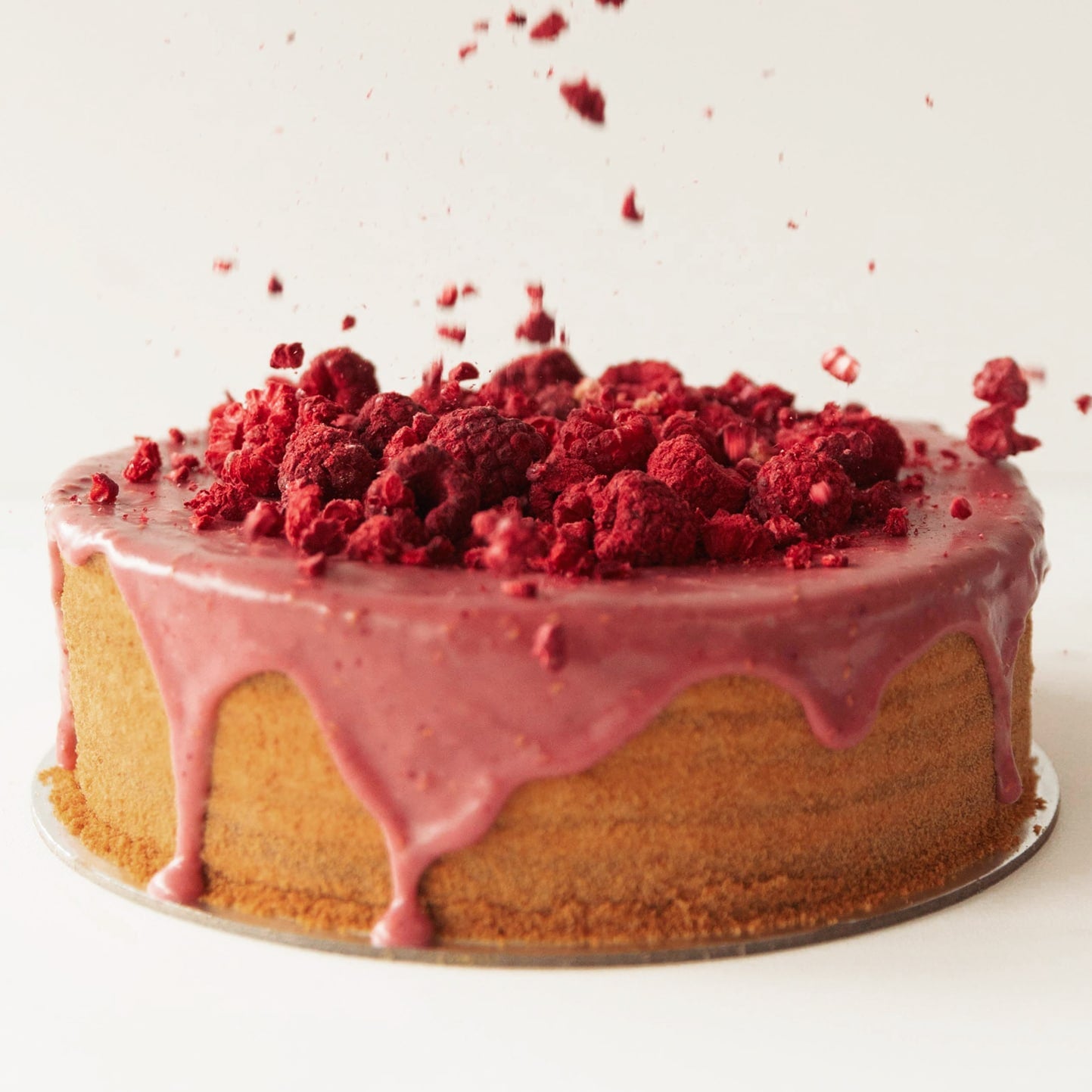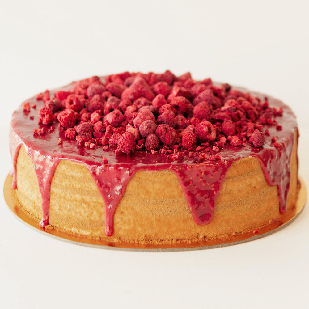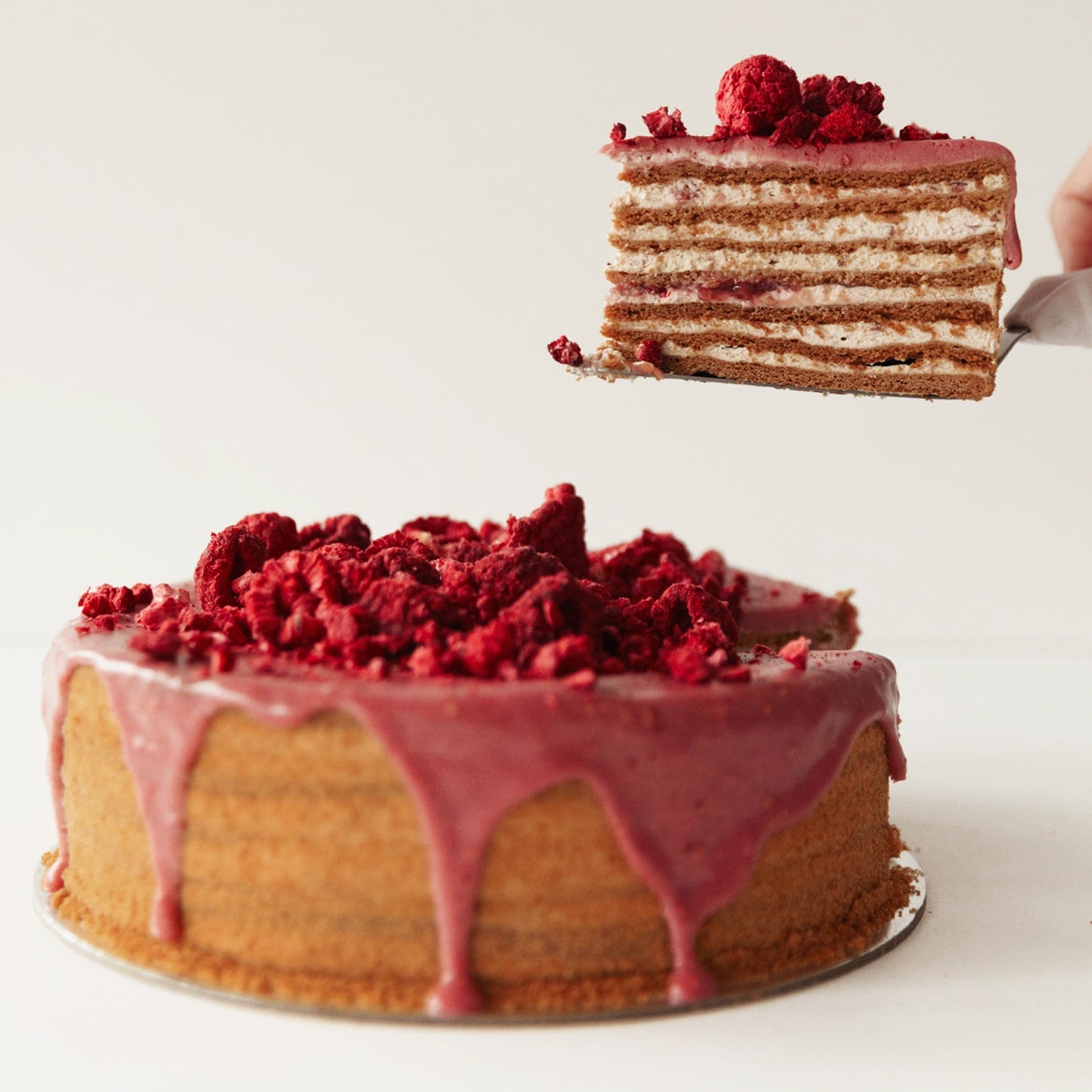 Raspberry Honey Cake - This is one of Christina's amazing twists on the Original Honey Cake. It is made of many thin caramelised honey layers held together with a cream of sweet and sour ingredients and Raspberries.