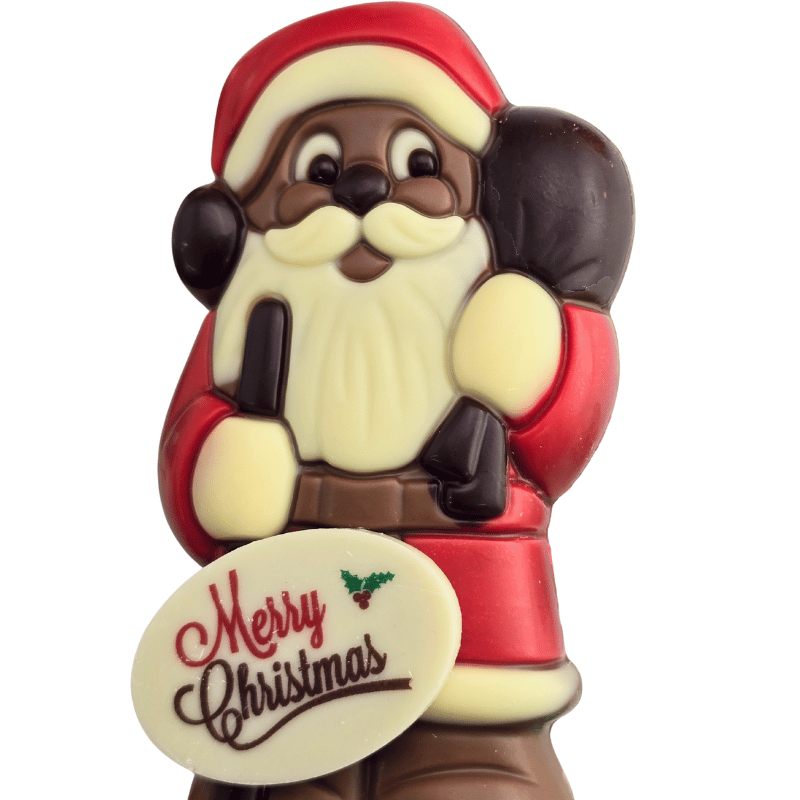 A mouth watering Christmas Santa with milk chocolate foiled stars and baubles and a Merry Christmas plaque. Presented in a cellophane gift box beautifully decorated with ribbon. Fun way to send your holiday greetings. Fine Belgian milk chocolate. 13cm