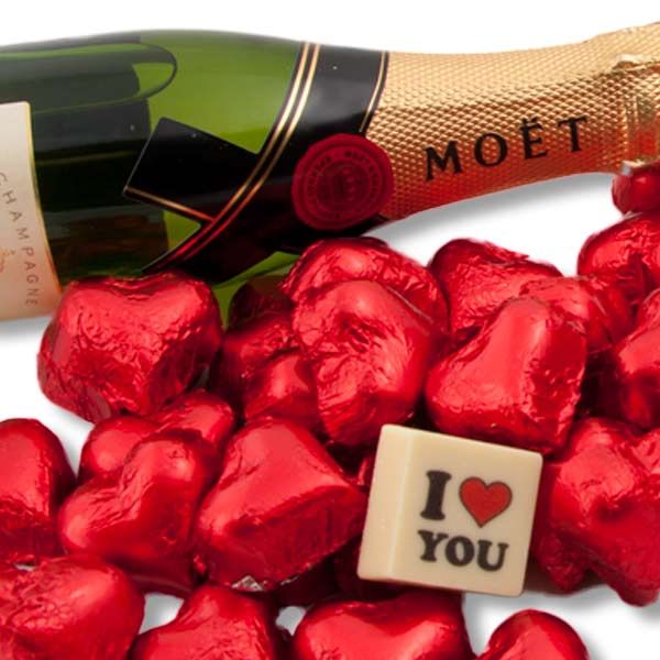 The delicious alternative to flowers. The ultimate in romantic Valentines gifts online that will be well received by all champagne and chocolate lovers. Packed in a gorgeous gift box with luxurious ribbon. Twenty six milk chocolate hearts. Net weight: 249g Moet Chandon 200ml