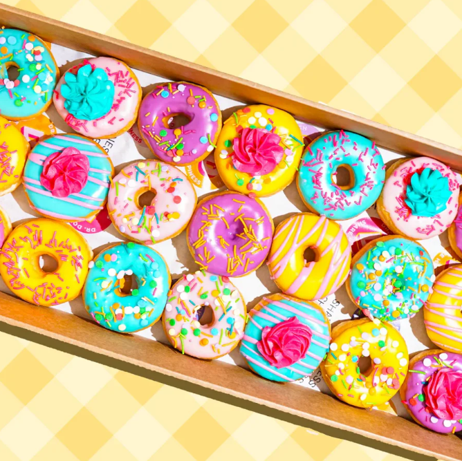 Donut Mix (WHEAT Flour, Canola Oil, Dextrose, MILK Solids, Emulsifier (481, 471), Salt, Raising Agents (541), Sodium Bicarbonate, SOY Flour, EGG, Thickener (412), Ascorbic Acid), Water, Vegetable Oil (Vegetable (Palm Based) Oil, Antioxidant (307)), Glaze (Sugar Syrups (Sucrose, Glucose)), Yeast, Confetti Sprinkles (Sugar, Corn Starch, Tapioca Starch, Non-hydrogenated Palm Oil, Gum, Shellac, Artificial Flavour, Colours (102, 110, 129, 127, 133)), Sprinkles (Sugar, Maize Starch, Vegetable Fat, Tapioca Starch, Glucose (WHEAT), SOY Lecithin, Colours (100, 102, 110, 122, 123, 124, 133), Glazing Agent (903), Emulsifier (492), Water), Vanilla Buttercream (Sugar, Vegetable Shortening (Vegetable Oil, Emulsifiers (435, 471), Antioxidant (307b)), Water, Maize Starch, Butter (MILK) (2.5%), Vegetable Oil (Antioxidant (307)), Humectant (422), Salt, EGGAlbumen Powder, Natural Flavour, Preservative (202), Citric Acid, Vegetable Gums (412, 466)), Strawberry Ganache (Vegetable Fats And Oils (Emulsifiers (322 SOY, 492), Antioxidant (307, 307b)), Sugar, MILK Solids, Cream Powder (MILK), Colour (120), Natural Flavour, Emulsifier (322 Soy)), Purple Colour (Water, Colours (127, 133), Emulsifiers (433, 405), Thickener (418) And Preservatives (211, 202)), Royal Blue (Water, Colours (133, 120), Emulsifiers (433, 405), Thickener (418) And Preservatives (211, 202)), Yellow Colour (Water, Colour (102), Emulsifiers (433, 405), Thickener (418), Preservatives (211, 202)).